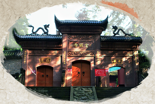 绿树掩映中的金凤寺 金凤寺建筑的整体布局,寺内是典型的川西民居型庭院式群体建筑,周边的亭、榭、迟、坊、廊、圆、墓、塔错落有致,殿堂具明清风格,镂雕石缸工艺精湛。